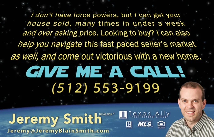 I want to be your real estate Jedi! You need someone with lots of knowledge and a pulse on the force of the current market. Real estate in Austin is REALLY fast paced sometimes, and, in my opinion, it's imperative to have an agent who is responsive and can help you act quickly, when it's convenient for YOUR schedule. If you don't have an agent that will answer their phone and emails throughout the day, then it just might end up costing you a house. Try me. Nights, weekends, whenever! Just give me a call, text, or email and see how quickly I respond. I typically have a sense of urgency about the things I do, and I encourage you to see how this personality trait can help you in real estate.